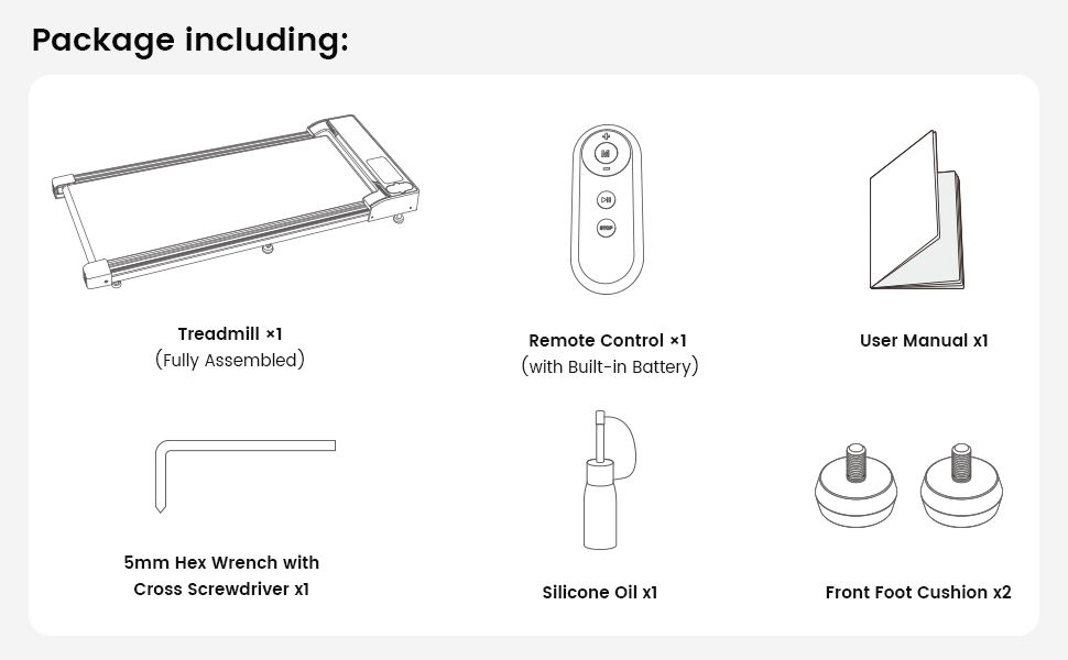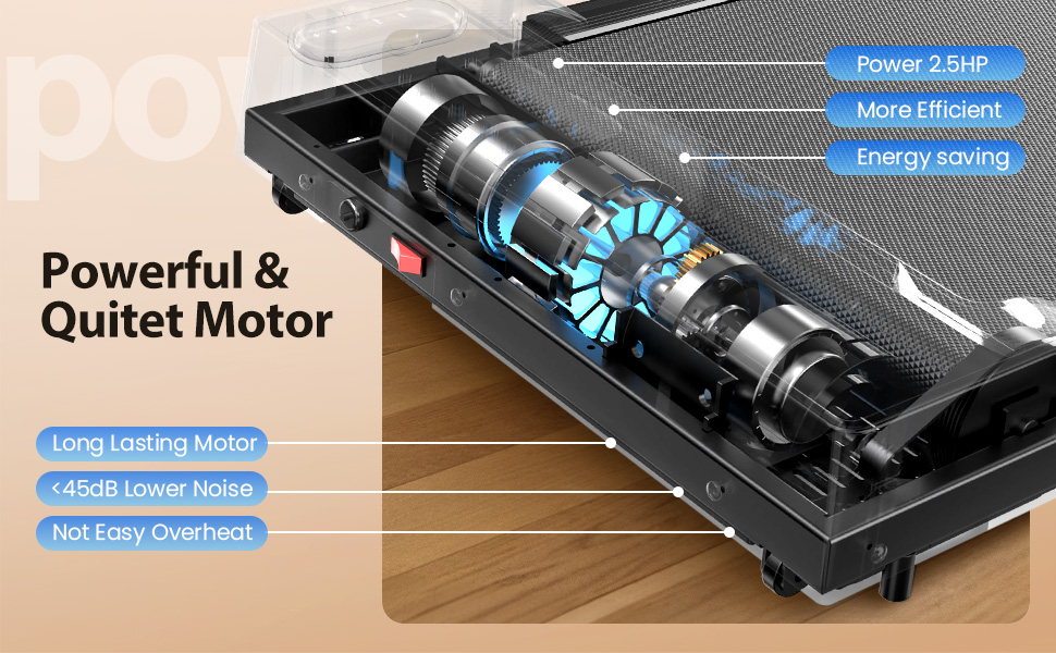 Equipped with a powerful 2.5 HP motor, which features low operating noise<45dB, enabling the treadmill to reach a maximum speed of 3.8 mph.