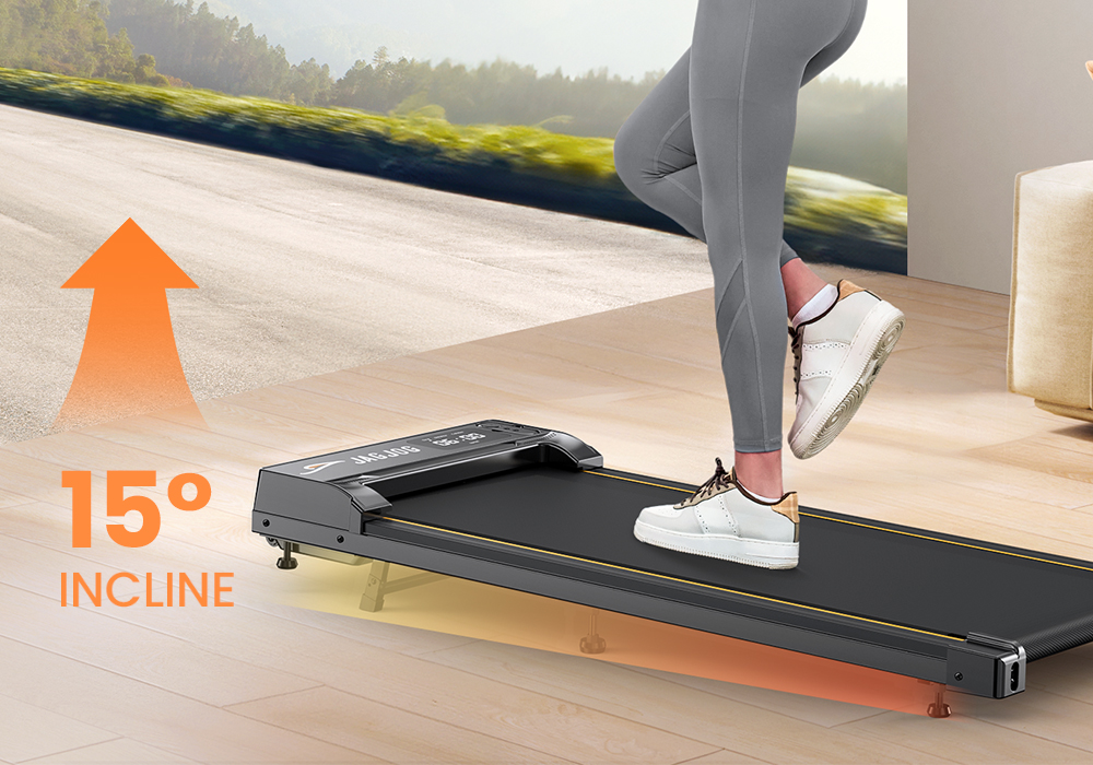 Seamlessly switch between 4 modes (Work, Walk, Jog, and Climb) with speeds ranging from 0.6 to 3.8 mph, and amplify fat-burning with the 15° incline for maximum efficiency.